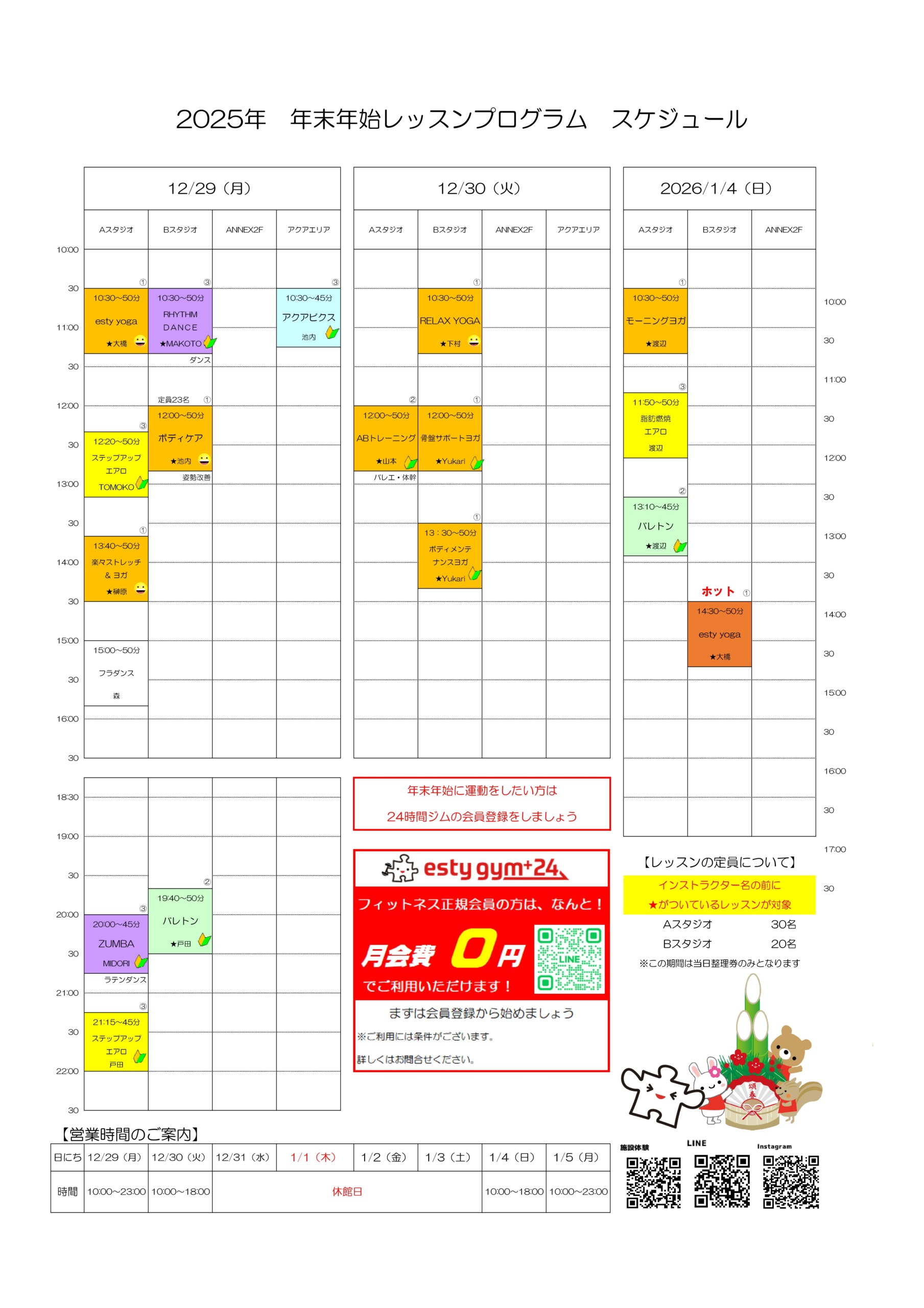 12/29(月) 通常営業 10:00~23:00 ※レッスンWEB予約はなし